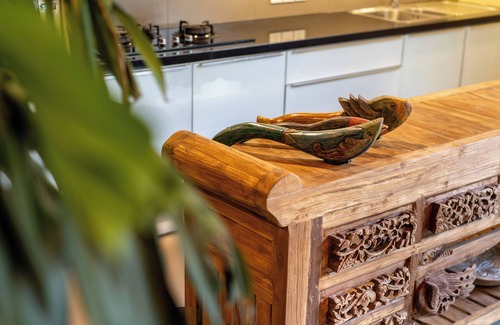 Step through carved Balinese doors into your private 3BR oasis with a crystal-clear pool, swim tether, and lush courtyard with sun lounging for 6 guests.