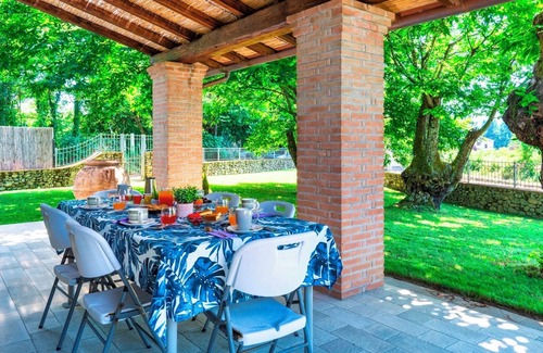 The villa is surrounded by a level garden with fenced lawn of about 500 sq m and with chestnut trees planted here and there to create privacy and natural shady areas. In the front area of the villa is the brick-built portico with a nice dining area, connected directly to the two rooms of the main living area: the kitchen and the living room.Please notice that photos are taken in spring, therefore flower blossoming, and the colours of the gardens' grass could be different at the moment of your arrival at the villa.