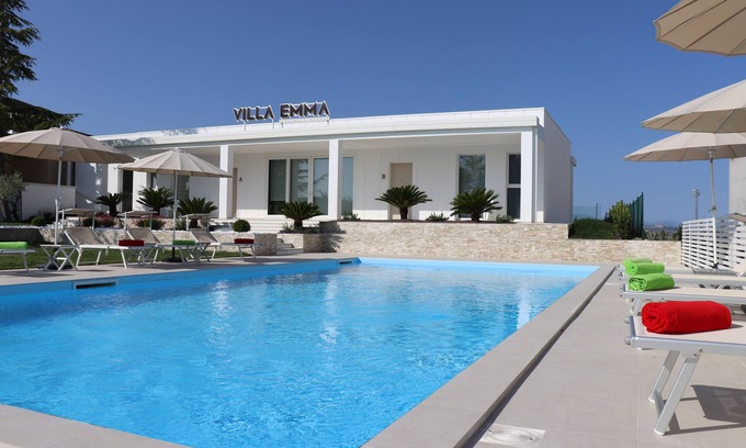 Villa Emma is a newly built house with 6 bedrooms private pool and private garden. The house is only 10 minutes from the sea and only 1 minutes from the city center. The house is all on one ground floor and enjoys a wonderful panoramic view. Guests have access to 4 rooms each with private entrance and each with its own bathroom, and also a mini-apartment with 2 other rooms. At home you will find the kitchen at your disposal complete with everything you need for your stay, so: gas stove, dishwasher, refrigerator and freezer, cutlery, glasses, tablecloths, pots, kettle, microwave etc ... You also have a large dining room and a table where you can eat together. The pool is 7m x 14mt large and is complete with deckchairs and umbrellas. Private parking available