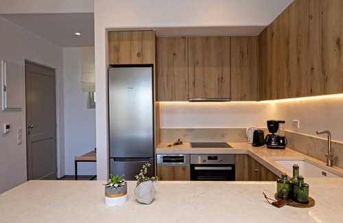 Dedicated to offer its guests a relaxing and luxurious stay , Villa Erato consists of a spacious living room - dining room ,a fully equipped kitchen and a small bath at the first floor ( entrance floor) . Access to the lower floor is through the large modern internal staircase , where three spacious bedrooms with ensuite baths ( one per bedroom) can accommodate up to six guests.