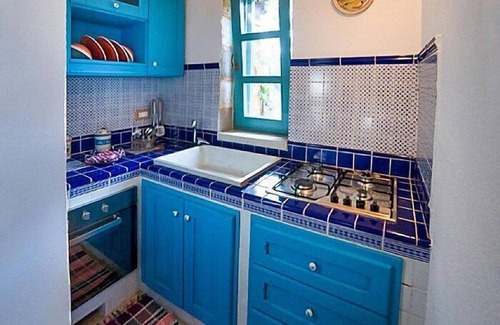 The living room is paved with characteristic stone tiles. The ceiling boasts a star vault. The furnishings are simple and comfortable. The furnishings include an armchair and a divan bed for one guest. The dining table can accommodate six guests. In this room you will find a television (local channels). From the living room you will be able to enter the patio and the garden through three French doors. The room is equipped with an air conditioning/heating unit.