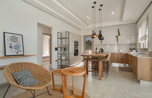 The villa Etherealvilla in kefalonia is the ideal accommodation for a relaxing holiday with a view of the Ionian Sea. The 150 m² property consists of a living room, a kitchen, 3 bedrooms and 2 bathrooms and can therefore accommodate 6 people. Additional amenities include Wi-Fi with a dedicated workspace for home office, a TV, air conditioning, a washing machine as well as a dryer. A baby cot is also available. This vacation rental offers a private outdoor area including a pool, covered terrace, balcony, and barbecue.