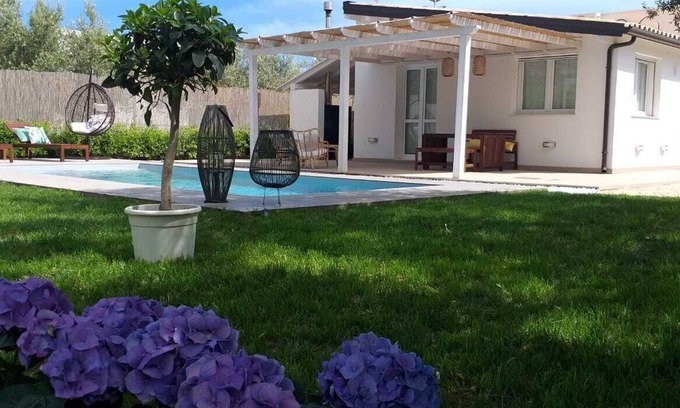 The newly built house has a private pool and is surrounded by olive trees, carob trees, citrus fruits and fruit trees. It has two bedrooms, an en-suite bathroom, an external bathroom, a large living room with a comfortable sofa-bed and a fully equipped kitchen, air conditioning and Wi-Fi. The house has at its total and exclusive availability a garden with a green lawn and barbecue. The veranda allows you to have lunch and dinner in total relaxation.