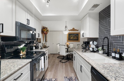 ~Modern fully stocked kitchen and comfy dining area with high end appliances, blender and cookware. If you enjoy cooking you will love this kitchen.