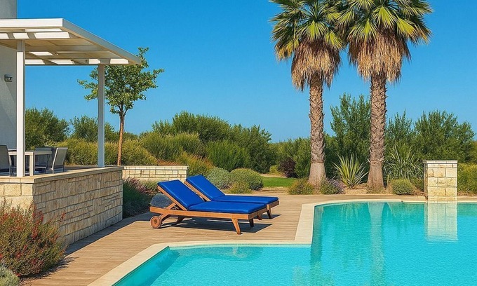 Surrounded by ancient olive trees and breathtaking landscapes, the villa is designed to offer an exclusive, authentic, and rejuvenating stay. An elegant refuge where the simplicity of modern design blends harmoniously with the surrounding environment, creating an atmosphere of absolute privacy and sophisticated simplicity.