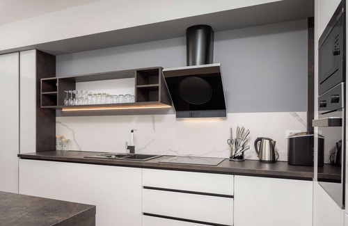 The apartment is located on the west side of the first floor of the villa and it have 80 square meters. It consists of two large bedrooms with double beds with nightstands, one of them has a makeup table and its own bathroom. Both bedrooms have a TV. Upon entering the apartment you will be greeted by a large bar that connects the dining table with chairs. The modern kitchen consists of a refrigerator, oven, dishwasher, microwave, kettle, coffee maker, toaster and ice maker. Inside there is a living room with a large sofa and two armchairs and two stools, which has a balcony and beautiful sea view. On the balcony there is a table and chairs for those who like to eat outdoors. Also, the apartment has two bathrooms, consisting of large shower, wash machine, hair dryer and towels. All rooms have air conditioning.