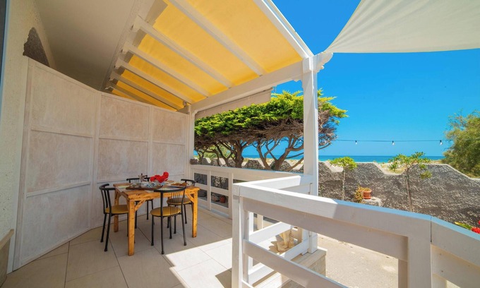 Stepping outside, guests can enjoy the sun-drenched exterior, which includes a fenced garden and an inviting outdoor dining area. The villa is situated right on the shore, providing stunning views of the coastline. An outdoor table and chairs create a perfect setting for al fresco dining or enjoying the gentle sea breeze.