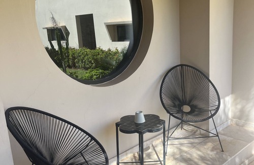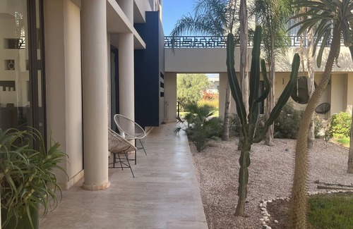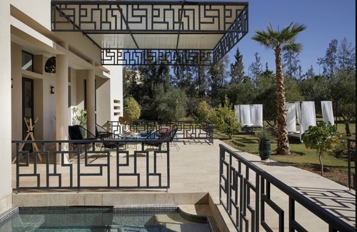 Magnificent "Art Déco" villa, with house staff. Large swimming pool, heated jaccuzi with outside beds and landscaped garden. Fitness room. 5 bedrooms. Stunning view of the Atlas mountains. Large terraces. Breakfast are included and served at the table. Preparation of lunches and dinners on request. Less than 5 minutes you will find indoor and outdoor paddles, tennis, quads, horses, camels, water-ski. Buggys rental at Agafay desert on request.