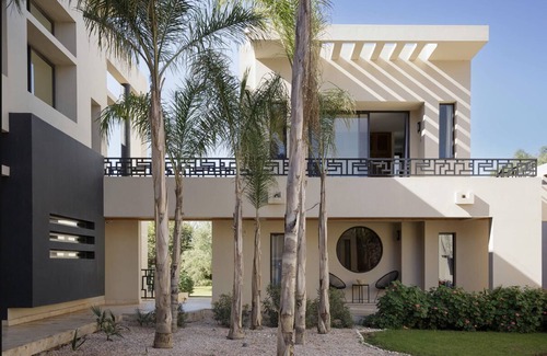Magnificent "Art Déco" villa, with house staff. Large swimming pool, heated jaccuzi with outside beds and landscaped garden. Fitness room. 7 bedrooms. Stunning view of the Atlas mountains. Large terraces. Breakfast are included and served at the table. Preparation of lunches and dinners on request. Less than 5 minutes you will find indoor and outdoor paddles, tennis, quads, horses, camels, water-ski. Buggys rental at Agafay desert on request.