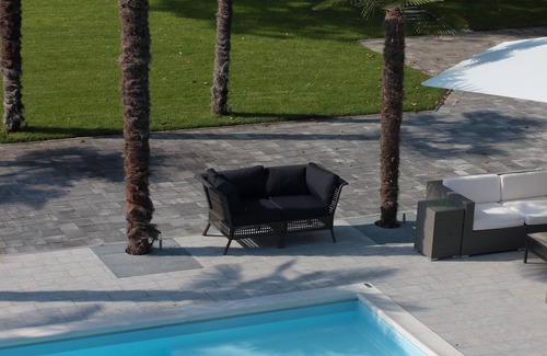 The large chlorine-free swimming pool (with stylish led lighting and hydro-jets) is the main feature of the villa. There is a heated outdoor shower, together with beach towels. Sunbeds, parasols and sofas are located next to the pool.