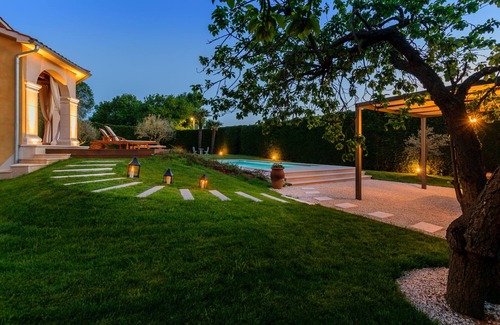 Villa Gilda is a lovely new villa, completed in 2021, with a lovely large garden and a large private pool. Luxurious interior design offers an unforgettable vacation for each of our guests. Luxurious interior, large living room, fully equipped kitchen, 2 bedrooms, each with its own bathroom offer peace for body and soul in the heart of Istria. There is also a hot tub in the master bedroom for a complete experience. A large landscaped garden with lots of green ensures complete privacy.Experience a unique vacation in luxury villa Gilda.The surroundings of Svetvinčenat, the pearl of tourism and culture of Istria, dominated by the medieval castle of Morosini-Grimani, offer additional motifs and opportunities to explore history in a fun way, and tailored to the whole familyPula, Rovinj, Rabac, Poreč and Fažana are all within a 20-30 minute drive Distances: post office 8500m, gas station 8500m, restaurant 3400m, shop 1700m, center 1700m, sea 15400m, beach 15400m, airport 24400m.