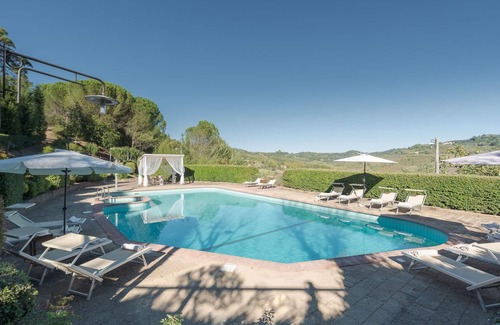 Villa Ginestraio is a magnificent property which is the result of meticulous renovation that has transformed an old 13th century Pisan watchtower into an exclusive place of relaxation and well-being. It is located about four kilometres from the lively historic borgo of Castelfalfi in the pictoresque countryside between the Era valley and the beautiful hills of Florentine Chianti. This elegant, two-storey villa, finely restructured with quality materials of Tuscan tradition, stands on a hill; on the top floor are the comfortable air-conditioned bedrooms with ensuite bathroom, each personalised by the warm, enveloping pastel shades of the romantic beds and by lovely ornaments and furnishing accessories, which can comfortably accommodate up to fourteen people in a location which is ideal both for families and for sports-loving and adventurous travellers, given the multitude of sports activities at your fingertips, like the most beautiful golf course in Tuscany, with 27 holes. The house contains a beautiful, spacious living room with billiard table, seating area and dining room connected to the professional kitchen that leads out to a panoramic porch overlooking the rolling hills and then on to a vast, manicured expanse of lawn with a cosy outdoor living area and a children's play area. The property is enhanced by a luxurious, enclosed pool area which includes a whirlpool and a gazebo set up for relaxing in the shade. Surrounding this inviting setting is the peaceful, regenerating atmosphere of nature, absolute protagonist here, and, at the same time, with plenty of opportunities to learn about the artistic wonders and the numerous borghi that surround Castelfalfi. N.B. The owner occasionally lives in an annex near the main house, a very kind and discreet lady who takes care of the maintenance of the garden and the swimming pool on the days agreed with the guests, but in full respect of their privacy.