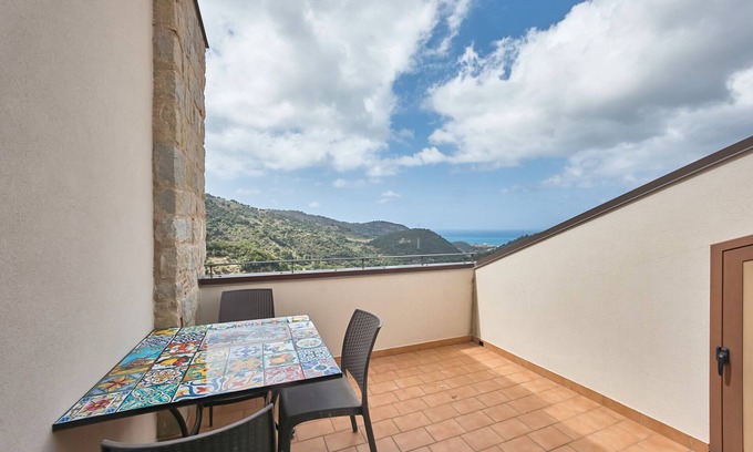 The Attic Room 4 in Ficarra offers 25 sqm of space for up to 2 guests. You have 1 bedroom and 1 bathroom at your disposal during your stay. The room features a private balcony with views of the mountains and the sea. Your comforts include air conditioning, Wi-Fi suitable for video calls, a dedicated workspace, beach towels, and breakfast included. These amenities ensure you have everything you need for a comfortable stay.