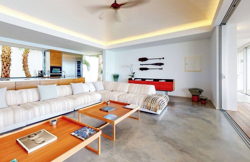Built on two levels in a modern style, the luxurious villa GINGER features a sleek and sophisticated design with white walls and polished concrete floors that provide a delightful sense of freshness. On the main level, the large indoor living room furnished with a sofa and benches opens onto the long, heated swimming pool and the terrace swept by tropical breezes. The modern kitchen is well equipped for cooking meals to be enjoyed around the large outdoor dining area that can accommodate up to ten people with views over the pool and the ocean. Very functional and bright, the kitchen opens onto both the living room and the small garden at the back of the house.