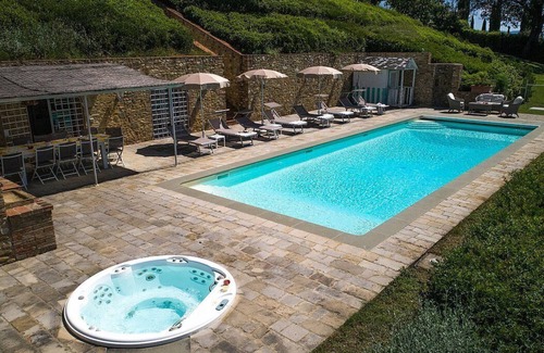 You will reach the swimming pool from the villa going down a route that cuts through the garden and includes approximately 40 stairway steps. The pool is 6 meters (20 feet) large by 12 meters (39 feet) long, from 1.20 meter (4 feet) to 2.20 meters (7.2 feet) deep. In the swimming pool area you will also find a heated jacuzzi pool with hydromassage. It is equipped with a table, chairs, sun umbrellas, sun loungers and an external shower. This area is also equipped with a small sofa and armchairs, and it is partly shaded by a characteristic pergola with a bamboo roof. From the swimming pool you will enjoy a bright view of the Tuscan hills and of the greenery. The pool is open from mid-April until mid-October. Here you will also find a brickwork barbecue.