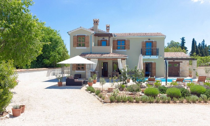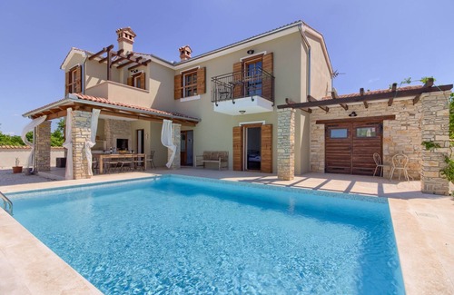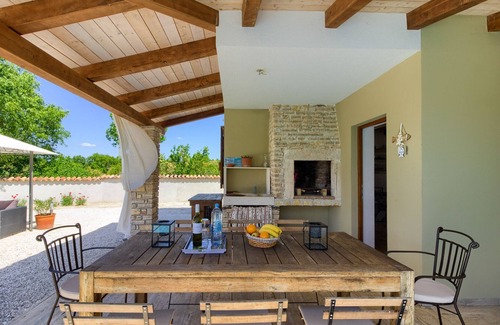 Beautiful Istrian villa with private poolThe wonderful villa Gracia Patricia is located in the calmness of the countryside, exactly in a small village of Central Istria.The villa is not so far away from the wonderfull beaches of the beautiful well known village of Fazana. This is a luxury villa in istrian style that can accomodate up to eight persons within its comfy four bedrooms. On the ground floor is located a cosy living room with fireplace that offers a warm home atmosphere. Next to the living room is a nice wooden fully equipped kitchen with a dining area. All bedrooms have ensuite bathrooms with shower and one of them is located on the ground floor. The remaining three bedrooms are located on the first floor and all have nice terraces where you can enjoy in a morning coffe and in a stunning view of the surroundings. In the garden there is a large swimming pool ideal to cool off from warm and sunny days. Next to the pool are sun loungers and a cozy covered lounge area. There is also large stone barbecue under a nice wooden covered terrace. The youngest will enjoyin the small football field. Villa Gracia Patricia is completely air conditioned, has WiFi, private parking lot inside the plot and everything you need for a perfect holiday!*Charging for an E-Car is €150 / week*