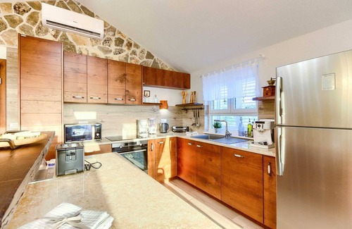 Occupying 500 m² beautiful Villa Grand View offers sevenensuite bedrooms, open plan living area with a corner sofa and a large flat screen TV for your entertainment, fully equipped specious kitchen with quality electrical appliances, a dining tablefit for a royal feast, plus a sports corner with a gym, pool table, table football and darts. With simple design and comfort in mind, exposed stone walls and wood beams create an inviting and warm ambiance, while a smart decor using the natural materials will impress any observer.Displaying authentic Dalmatian architecture of limestone, the house lies on a 1000 m² with a large outdoor pool, Jacuzzi, sauna, outdoor covered lounge area, terrace with lovely sea views and acomplete additionalsummer kitchen overlooking the pool, as well as a children’s playground with plenty of green lawn for playtime. Lovely hosts provide 2e-bikesand 2 traditional bicycles for your use.