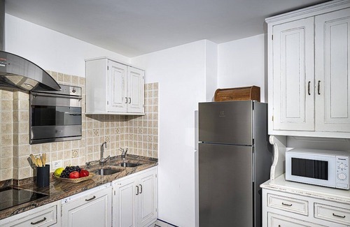 The furnishings of the living room are elegant and bright, and include a sofa and an armchair. The dining table can accommodate four guests. In this room you will find a satellite television (local channels). From the living room you will be able to enter a small patio with a view of the sea through two French doors. The room is equipped with an air conditioning/heating unit.