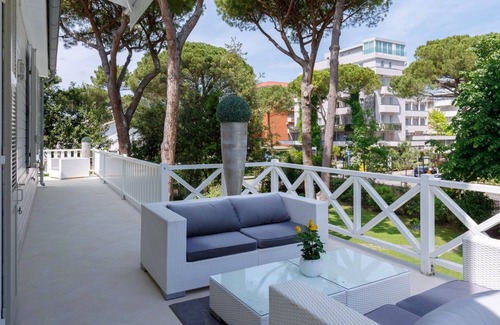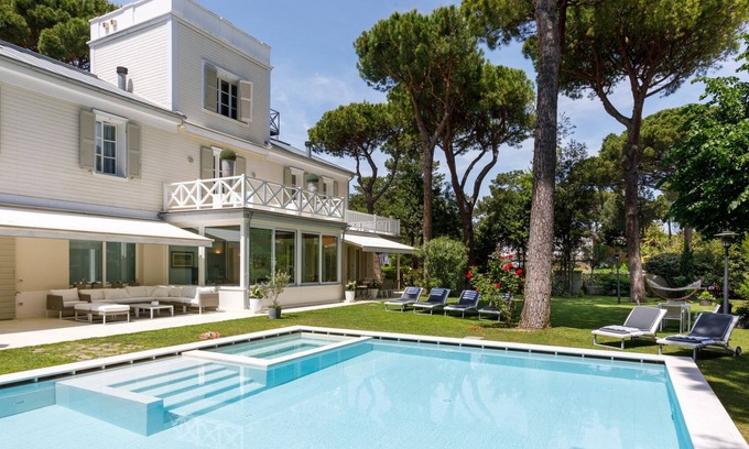 Villa Guidi is a modern villa located a few steps from a sandy beach in Milano Marittima, on the Romagna coast. This elegant white villa is surrounded by a lush garden shaded by tall maritime pine trees and is spread over three levels connected by an elevator and internal staircase. It can accommodate up to ten people comfortably in five bedrooms. The spacious and contemporary interiors include two open-plan living areas, modern kitchens, a private gym, and a sauna. Outside, a terrace with a seating area and dining area for outdoor dining overlooks the lawn, pool, and heated hot tub. Restaurants, beach clubs and boutiques are just a few minutes' walk from the villa. With the bustling city center nearby and family-friendly attractions like Mirabilandia and Aquafan within easy reach, Villa Guidi is perfect for families or groups of friends.