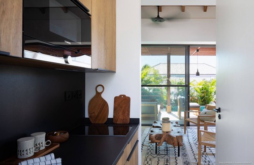Contemporary and refined, villa Gypsea in St. Barths welcomes guests in large spaces open onto the ocean and the lush tropical vegetation. The living room is comfortably furnished with a sofa in front of a large TV screen ideal for pleasant movie nights. The dining room with a splendid raw wood table welcomes up to eight guests, close to the well-equipped kitchen with a breakfast bar. The house is decorated with warm wood and taupe hints, while the natural light of St. Barths comes in through the openings located at the front and at the back, where you’ll find a nice space with a lovely lawn and charming hanging chairs. The gentle trade winds create a delightful quiet atmosphere in this most comfortable and paradise scenery.