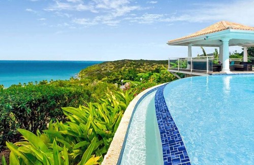 Entering the villa, the stunning panoramic views dazzle with a brilliant sweep of tropical green mountains and endless blue sea and sky. Anguilla is on the horizon. Just below the deck, you see waves crashing on the beach. Surrounding the villa are colorful gardens filled with tropical flowers as well as papaya and banana trees. The blue endless heated pool connects the amazing view to the villa. The spacious horseshoe shaped epi wood terrace is filled with outdoor dining and seating to enjoy the view and wonderful breezes. Little seating niches and a large covered gazebo offer quiet places to relax.