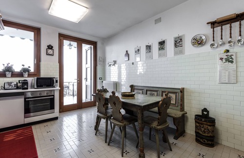 The main entrance places you on the 1st floor where you enter into the spacious and bright living area with lounge and dining areas. Two large comfortable sofas sit between a rustic fireplace on one side and the SMART TV on the other. On the same floor there is a spacious Tyrolese style kitchen, fully equipped with refrigerator/freezer, gas stove, dishwasher, Nespresso coffee machine, microwave, pots and pans, plates and silverware.