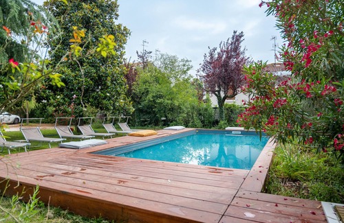 The villa is set in a spacious 3500 m² park filled with centuries-old trees. The park features a swimming pool, a relaxation area, picnic tables and chairs, and a barbecue for guests to enjoy.