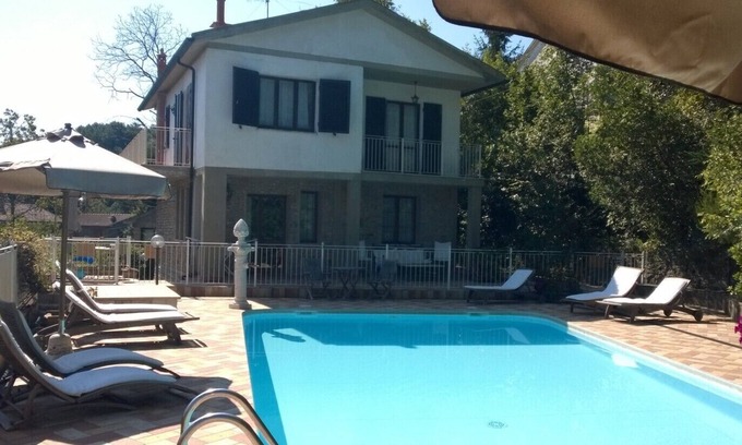 This beautiful villa is part of a large 2000m2 park situated on the crest of a hill near a chestnut forest in the village of Valcanina Sassetta. The park contains many species of plants and is classified as a botanical garden. The house is situated at an altitude of 500 meters above sea level and is only 800 meters from the village of Sassetta where you will find everything you need such as a mini-supermarket, restaurants and coffee bars. The sea and beach of Marina di Castagneto is 12 km away and helps make this area an ideal destination for a complete and relaxing holiday. Guests can use the large swimming pool which is also available for guests of the adjacent villa. From the fisrt floor you have a view of the “Pian delle Vigne” valley and the surrounding villages. There is ample private parking available.