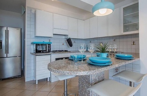 The furnishings of the living room are modern and welcoming, and include a sofa. The dining table can accommodate ten guests. In this room you will find a large flat-screen satellite television (local channels). From the living room you will be able to enter the first terrace through two French doors. The room is equipped with an air conditioning/heating unit.