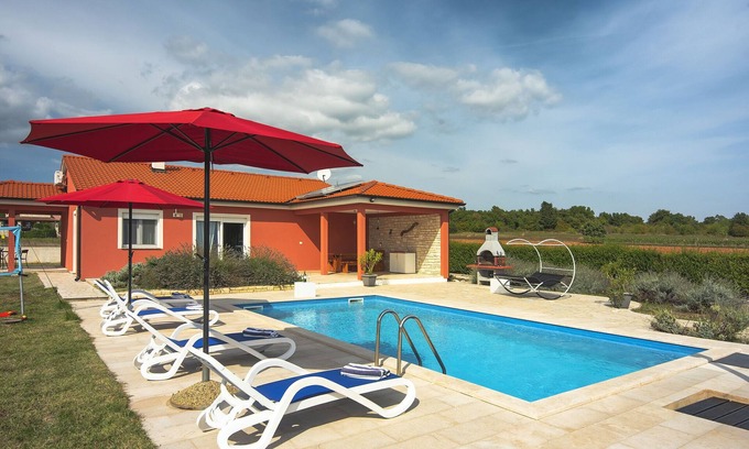 This pet-friendly villa in Barban has 3 bedrooms accommodating a group of 7 or families with children comfortably. It comes with a private swimming pool and air conditioning. You can spend time enjoying the marvellous beach at 900 m. If you like to try some sports, just head to the sports field at 3 km. For testing, the local cuisine restaurants are at 3 km and daily groceries can be bought from supermarkets at 3 km. Indoors are comfortable with air conditioning and a spacious living room has a single sofa bed and TV. A game of table tennis would be ideal to spend time. You can enjoy the outside shower and relax amidst lush greenery in the garden. Kids will be happy with the play equipment and the terrace is ideal for a barbecue. 1 pet is allowed at $ 10 per night. Parking is also allowed here. The villa is not suitable for youth groups. In 25 km you can find the airport and train station while public transport is at 500 m.