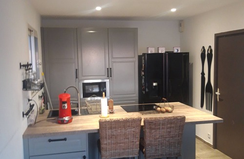30 mins from Arles, 40 mins from Nimes 4 beautiful bedrooms, 2 bathrooms, a large living room of 80m2, sleeps 10, enclosed garden, summer kitchen equipped with fridge, counter, freezer, sink, plancha, a idyllic setting.