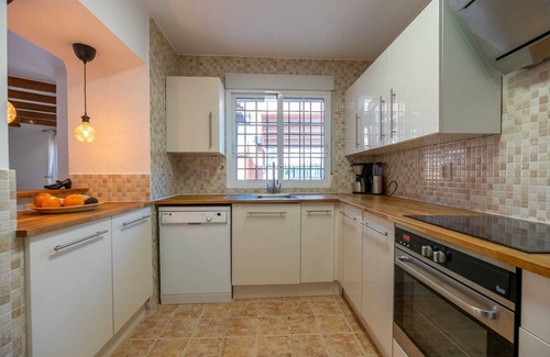 Layout: Ground floor: (open kitchen(hob(induction), electric kettle, hood, coffee machine(cups, filter), oven, microwave, dishwasher, fridge-freezer), Living/diningroom(TV(flatscreen), dining table(4 persons), seating area, garden doors, air conditioning, insect screens), bedroom(single bed, single bed, air conditioning), bedroom(double bed, air conditioning), bathroom(shower(unit), washbasin, toilet), bathroom(bathtub with shower, washbasin, toilet), conservatory/veranda(lounge set, insect screens), storage(freezer, tumble dryer, washing machine, ironing board, iron), heating(central)) On the 1st floor: (roof terrace) outdoor kitchen, carport, bar(eating bar), shower(outside), terrace(private, roofed), garden(private, fenced), garden furniture(4 persons), sun loungers, BBQ(gas), parasol, swimming pool(private, outside), Sunscreen