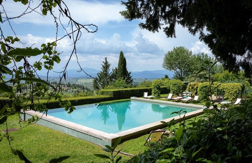 Castello di Tizzano is a historical residence made up of a large complex, consisting of the villa, the tower, a romantic park, the French garden, the outside infinity-edge pool (12×8 m, 1.50 m deep) surrounded by olive groves and a sunbathing. The breathtaking panoramic terrace overlooks the rolling hills of Chianti and the Dome of Florence Cathedral. The Castle has been the residence of many illustrious Florentine families throughout the centuries, such as Scolari, the family of the famous general Pippo Spano, and the Pitti, before becoming the property of the Medici family. By the mid-1500s, the current main building of Tizzi was rebuilt along the ruins of the ancient castle. In 1585, it was donated by the Grand Duke Francesco de Medici to the well-known sculptor Giambologna, and on his death passed to his pupil Pietro Tacca. The accommodation outside the castle remained unchanged until 1793. During the Napoleonic era, the castle was bought by Prince Talleyrand, until the second half of the 1800s when it was purchased by Count Roberto Pandolfini and his wife Beatrice dei Principi Corsini. Since then, the Villa has been still owned by the Counts Pandolfini. In 1999, Elizabeth Pandolfini inherited the ownership of the castle from her father and began a long work of restoration in order to bring the structure back to its former glory. The villa is suitable for people with handicaps