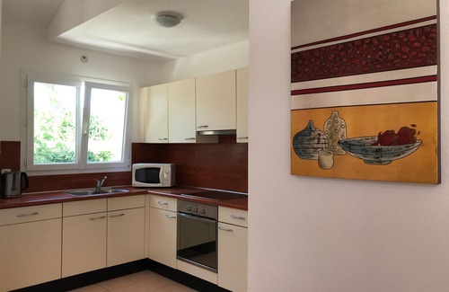 Layout: Ground floor: (open kitchen(boiling water tap, toaster, coffee machine, oven, microwave, dishwasher, fridge-freezer), pantry(washing machine), pantry, Living/diningroom(TV, dining table(6 persons), fireplace, seating area(6 persons)), bedroom(single bed(90 x 190 cm), single bed(90 x 190 cm)), bedroom(single bed(90 x 190 cm), single bed(90 x 190 cm)), bathroom(bathtub with shower, toilet), bathroom(shower), toilet(toilet)) Bubble bath(paid), infrared sauna(paid), washing machine, heating, terrace, garden, bicycle storage, garden furniture, BBQ, parking, swimming pool(shared with other guests, including separate children’s swimming pool (depth 50cm)), boules court, table tennis table, bicycles available(paid)