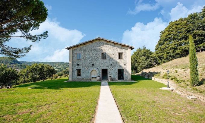 This beautiful villa is in a quiet location in the hills with a panoramic view. It is just a few kilometers from Orvieto, in the heart of the Tuscia area between Umbria, Lazio and Tuscany. The farmhouse was built in the typical Umbrian fashion in the 19th century. Although now restored, the traditional style has been preserved and the interior is furnished with original furniture. There are antique terracotta floors, wood-beamed ceilings, romantic stones and a fireplace. Guests can enjoy the feeling of living in a picturesque Italian country house, with stunning views all around. 4 bedrooms and lavish interiors make it ideal for a group of 8 people. Outside, guests will enjoy eating at the terrace. The infinity swimming pool is surrounded by a large area with umbrellas and sun loungers. The large garden and the long driveway guarantee peace and privacy. There are various nature trails from Villa Marina. In the area are olive trees, vineyards, fields and forests for walking or cycling. Nearby are nature parks such as the Alviano oasis, Monte Rufeno and Lake Bolsena.