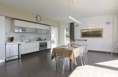 The villa (500 sqm), set on 3 floors and decorated in a modern style, can accommodate up to 10+1 people for a total of 5 bedrooms and 5 bathrooms (including 4 ensuites).