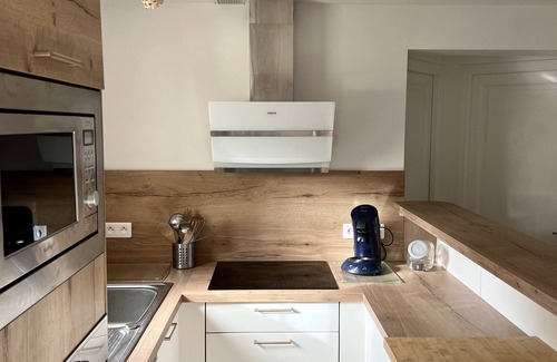 Bedroom 1 on the ground floor (1 bed 160 x 200). Bedroom 2 upstairs (1 bed 160 x 190). Mezzanine (1 sofa bed and 2 bunk beds). Fully equipped kitchen open to the living room.