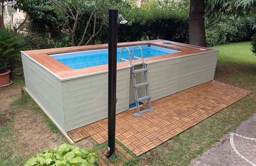 The house is surrounded by spacious terraces and a fenced private garden on three sides, ideal for sunbathing, reading in the shade, dining outdoors, or cooling off in the mini pool (4m x 2m, depth 0.9m) after a day exploring Rome.