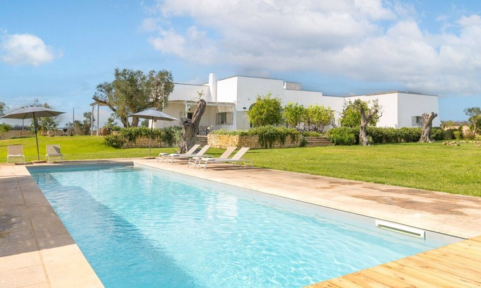 Consider renting Villa Monamu for a relaxing vacation in Puglia. This charming villa features vaulted farmhouse ceilings, local stone and cocciopesto bathrooms. It can accommodate up to ten guests in its five bedrooms and six bathrooms spread across two separate units. The main floor includes a spacious living room, dining room, a well-equipped kitchen, and access to a beautiful garden with a patio, covered veranda, and a 15x4m swimming pool.