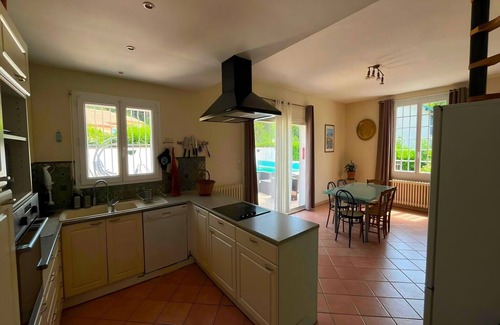 This beautiful villa with private pool welcomes you in a green setting, in the Cathar country. 20 km from Carcassonne, in the Aude, this beautiful holiday home is located in the village of St Denis. It is peacefully situated and ideal for holidays with family or friends. Around the village of St Denis, on the southern slopes of the Montagne Noire, you can enjoy cycling and hiking. Visit the numerous lakes and rivers, the vineyards of the Cabardès, the Cathar castles, the traditional markets (Revel, Carcassonne) and the impressive caves (Limousis, Cabrespine). Canyoning is one of the possibilities in the Montagne Noire. Take a tour of the city and castle of Carcassonne, visit an essential oil distillery in Castelnaudary (22 km), take a break at the Étangs de Saïx leisure centre (25 km) and go rafting on the Aude river in Alet-les-Bains (40 km). From the terrace in the shade of the pergola, you can fully enjoy the view of the Pyrenees. The garden is enclosed and equipped with a barbecue, comfortable garden furniture for 6 people and a private swimming pool of 10 x 5. Smoke Detector installed in Kitchen