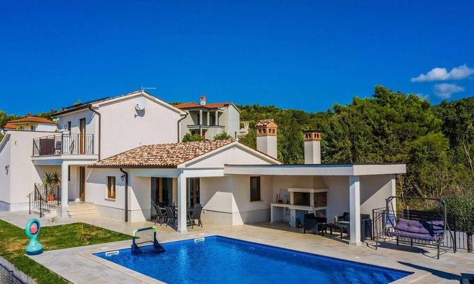 This is a modern 4-bedroom villa in Sveti Lovrec. It has a private swimming pool and is close to the hilltop town of Labin. It's perfect for a vacation with friends.The medieval hilltop village of Labin is only 14 km away. This town features narrow alleyways with workshops, art galleries and restaurants. A little further you will find the beautiful pebble beaches of Rabac. The nearest beach is 3 km away. You will find a restaurant and a supermarket 2 and 3 km away, respectively.The home has a billiards table, a garden with furniture and a barbecue. It offers bed linen, air conditioning, and bath towels.Pula airport is 44 km away.