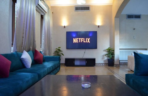 Luxury Royal Villa. This 5-bedroom haven seamlessly fuses modern elegance with traditional charm. Enjoy spacious interiors, a lush garden, and a refreshing pool, spacious indoor parking that can accommodate 3 cars. The rooftop unveils panoramic city views. Airport taxi service. Just 5 minutes from Jamaa El-fnaa and the airport and 7 minutes from Gueliz.