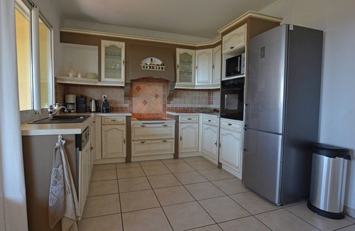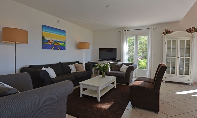 This delightful villa is set on a private 1,200 m² gated plot with remote control access, offering both security and privacy. It features a spacious covered terrace with direct access to a heated swimming pool, open from April to October—perfect for relaxing holidays with family or friends. Please note, pets are not allowed.