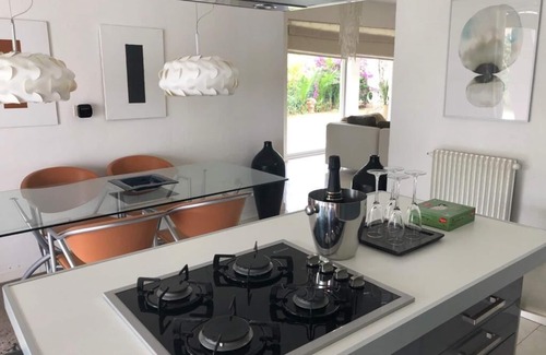 The modern kitchen with island is equipped with all utensils and utensils needed to prepare meals. Dishes, cutlery and good-value glasses are at guests' disposal. A technological and brand new tea, coffee, cappuccino, chocolate and tea-making machine is also present.