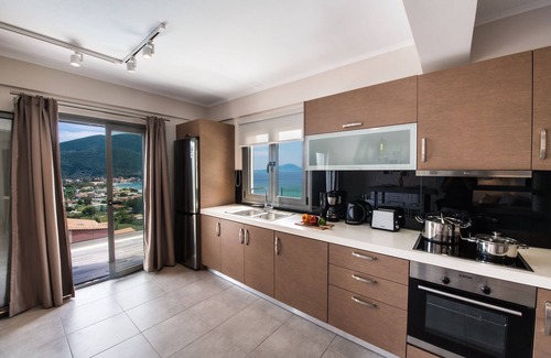 On the mountain above Vasiliki Village, with a breath-taking panoramic view across the Ionian Sea, is beautiful Villa Irene in Lefkada. The privileged location of Villa Irene is an absolute plus as it is at a short drive from the fishing village of Vasiliki and famous windsurfing hot spot of Ponti Beach.