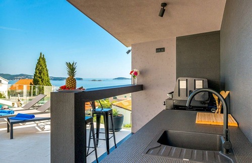 The outdoor space is equally impressive, with a glass-fronted terrace that maximises the sea views. There's an outdoor kitchen, BBQ area, bar seating and plenty of loungers for sunbathing or relaxing in the shade.