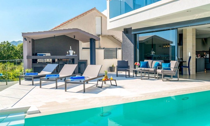Just a short drive from Dubrovnik, Villa Izak is a sleek and stylish retreat offering comfort and incredible views. The standout feature is a heated infinity pool with a built-in massage function, set on a spacious terrace overlooking the sea and terracotta rooftops.