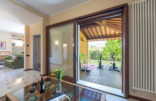 The park and the garden, completely fenced-in with netting and hedge screens (height about 2 m) guaranteeing privacy, extends over an area of about 2500 sq m which includes a 2-car parking area near the entrance gate. The garden surrounding the villa consists of paved surfaces in terracotta and large areas of lawn enlivened by flowering bushes, olive trees, cypresses, lime trees and a shady catalpa with two benches under it. The large stone portico outside the kitchen, is equipped with table and chairs for outdoor dining. NB. Near the villa (about 300 m away), not visible from any side, is an abandoned industrial shed.Please notice that photos are taken in spring, therefore flower blossoming, and the colours of the gardens' grass could be different at the moment of your arrival at the villa.