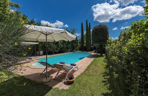 Just 10 m from the villa, the swimming pool lies in the centre of the garden and is accessible via a strech of garden. The rectangular-shaped pool has one oval side, Roman steps and a stone border. Lined in PVC, it measures 6 x 12 m with the depth varying from 1.20 to 2.10 m and it has internal lighting. It has chlorine purification. The sunbathing area, paved in serena stone around the pool, extends to the manicured lawn with sunbeds, a gazebo with table and chairs for outdoor dining and a convenient solar shower. The pool is open from the last Saturday in April until the first Saturday in October.