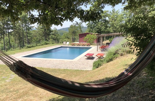 Guests will have exclusive access to the swimming pool (approx. 8x17 meters), complete with sunbeds and a shaded pergola. The villa overlooks a large lawn and a valley that gently slopes towards Lake Bilancino in the distance.